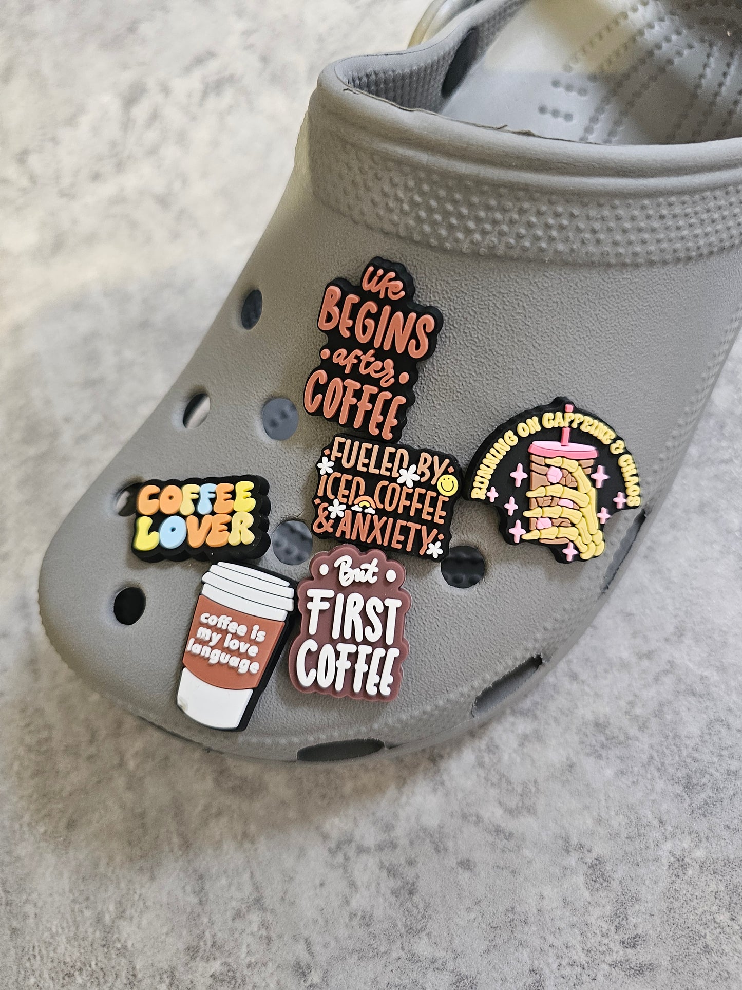 Coffee shoe charms, iced coffee, coffee addict